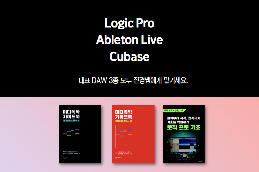 진경쌤은 <미디독학 가이드북> 에이블톤 편과 큐베이스 편의 저자입니다. 두 DAW 모두 책을 출간하실 만큼 깊이 있게 다루고, 동시에 1458CLASS 로직 프로 강의의 대표 강사로도 함께하고 계십니다.